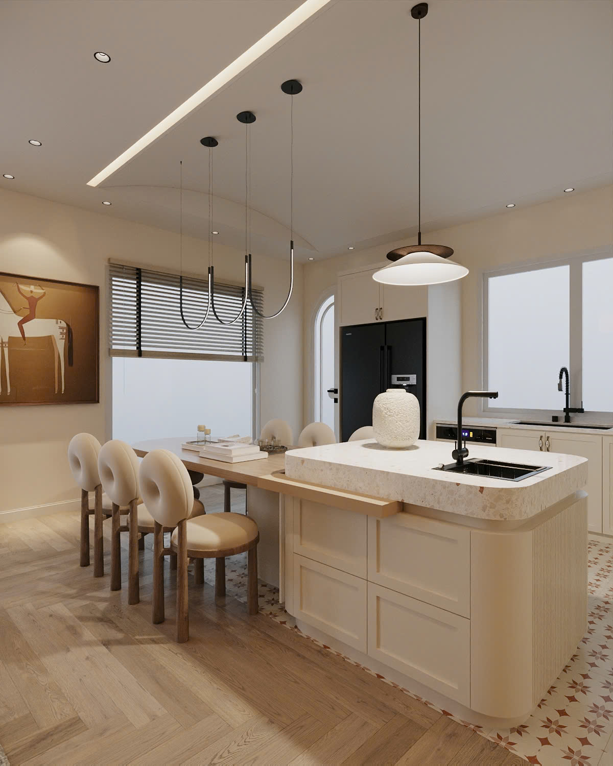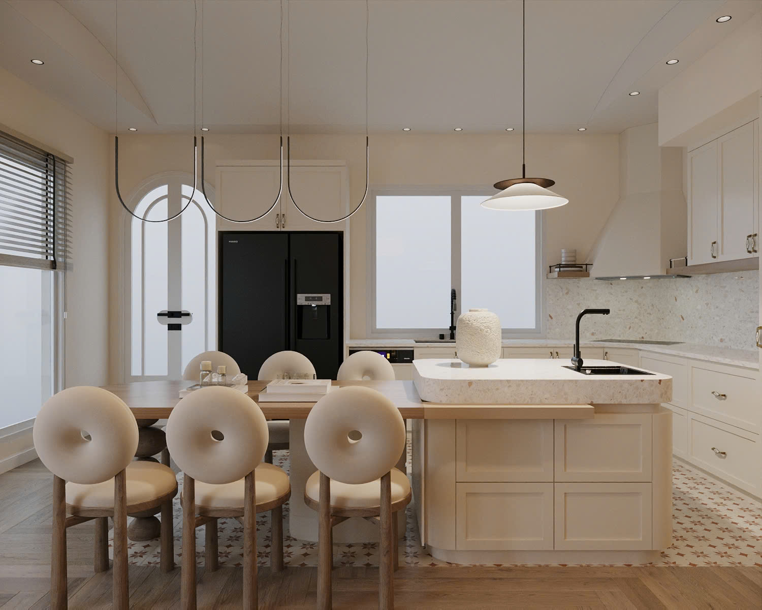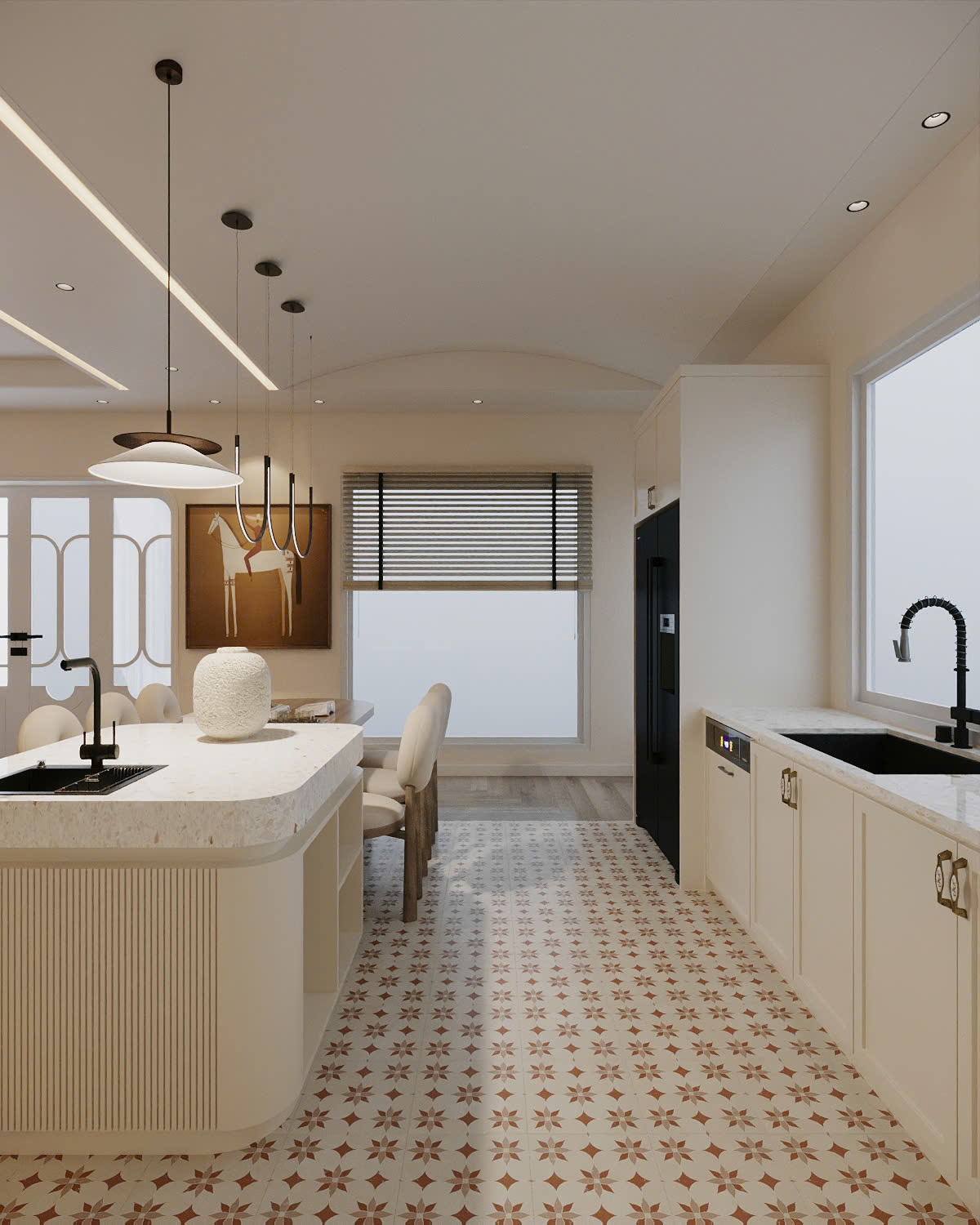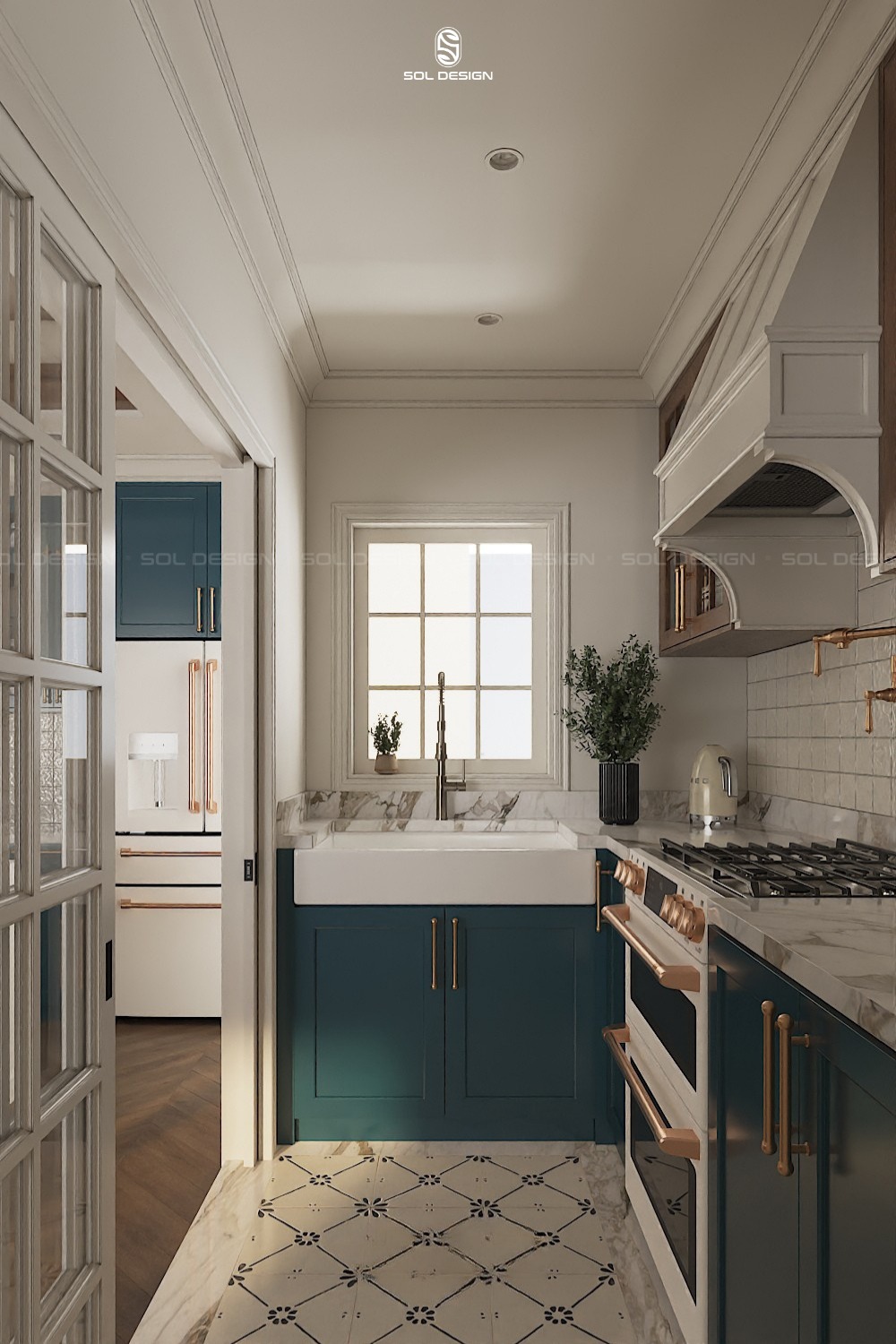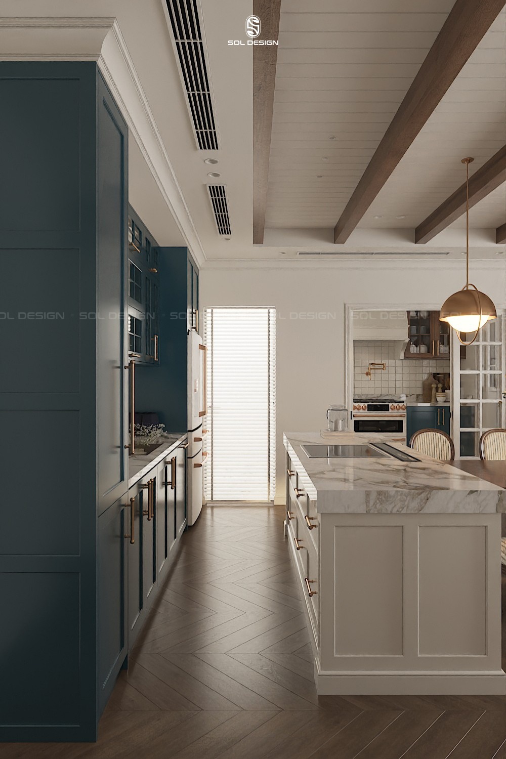 Bên cạnh hướng tiếp cận Modern Farmhouse thuần, Sol Design cũng linh hoạt kết hợp phong cách này với Scandinavian để tạo ra một phiên bản nhẹ nhàng và phù hợp hơn với không gian nhà phố. Ở dự án bếp này, tinh thần Farmhouse không được thể hiện theo hướng đậm chất “đồng quê”. Mà được tiết chế và làm sáng lên thông qua bảng màu và cách xử lý chi tiết.
